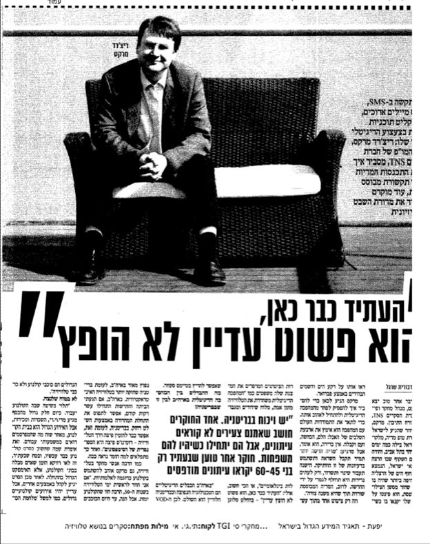 At least one good thing happened to Richard Marks, Research and Development director of the iTRAM sector, in TNS, in his visit to the Middle East. Marks arrived from London to a convention organized by Top Media, one of TNS Israel customers, spent some especially sunny days in Tel Aviv and admitted that the transparent auditorium located in a restaurant on Herzelia Pituah beach – where he lectured in front of the Israeli advertising agents – is the most beautiful he has ever been. When he returned from a shooting session on the balcony, he fantasized about how jealous his friends in TNS London will be when they will see the photos against the sea and the bright blue skies in the middle of February.